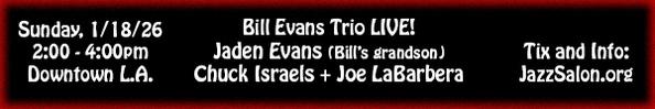 Sunday, January 18th at the LA Athletic Club, Downtown - Join two long-time members of the Bill Evans Trio (bassist Chuck Israels and drummer Joe La Barbera) as they join forces with pianists Jaden Evans (Bill's grandson) and Tamir Hendelman for an unforgettable afternoon of classic Bill Evans music, sponsored by the Jazz Salon. 2PM